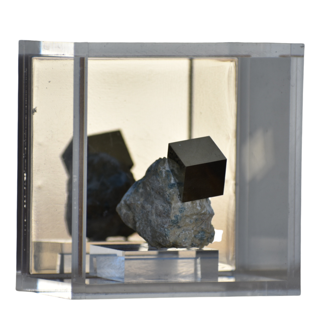 MINERALOGY: Spanish Pyrite is a beautiful mineral that naturally forms into cubic crystal structures. Pyrite has the chemical formula FeS2, meaning a single iron atom is bonded to two sulfur atoms. This gives pyrite the capability to form simple cuboidal crystals, under the right environmental conditions.