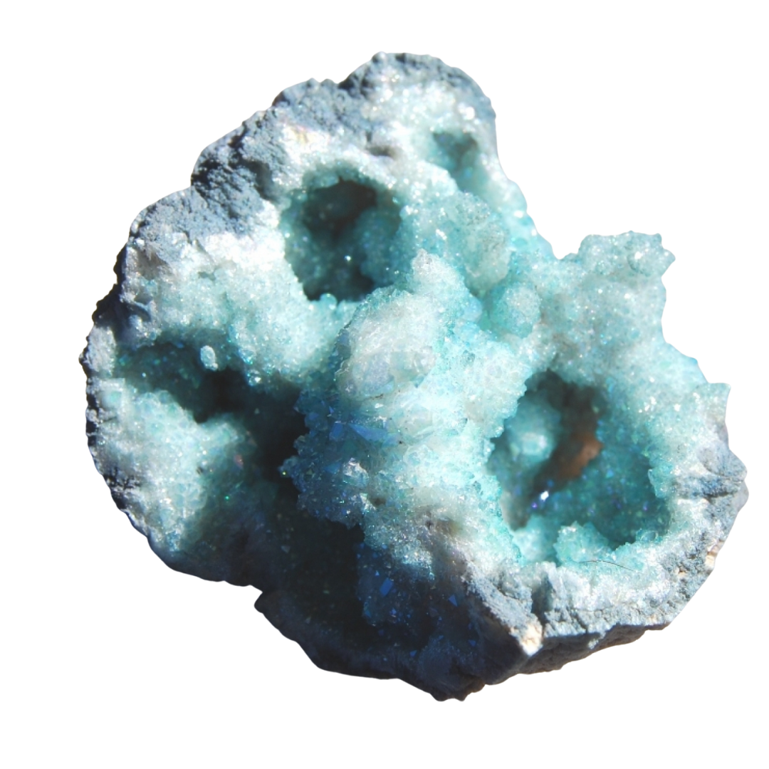 MINERALOGY: Aqua Aura is created in a vacuum chamber from quartz crystals and gold vapour by vapour deposition. The quartz is heated to 871 °C (1600 °F) in a vacuum, and then gold vapor is added to the chamber. The gold atoms fuse to the crystal’s surface, which gives the crystal an iridescent metallic sheen.